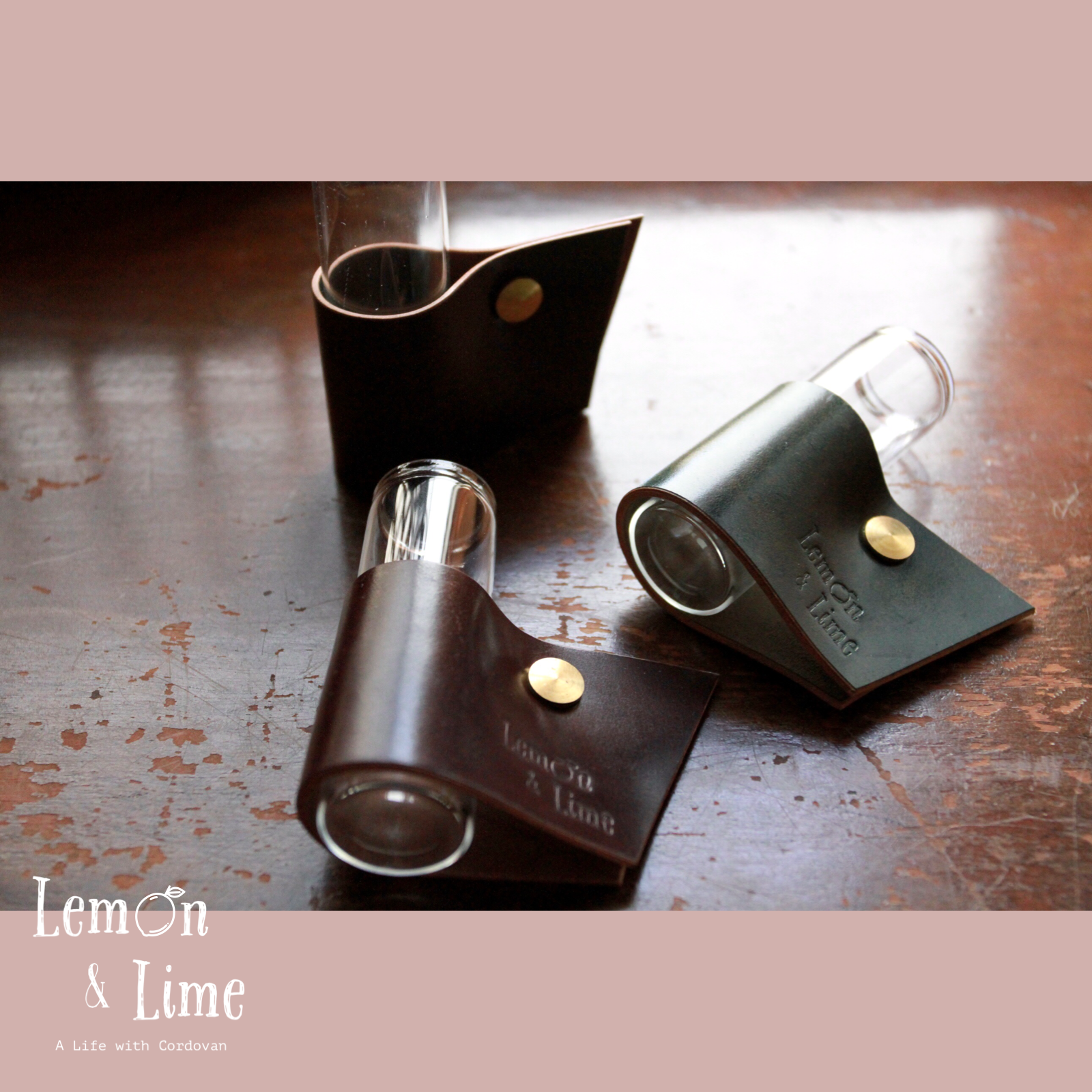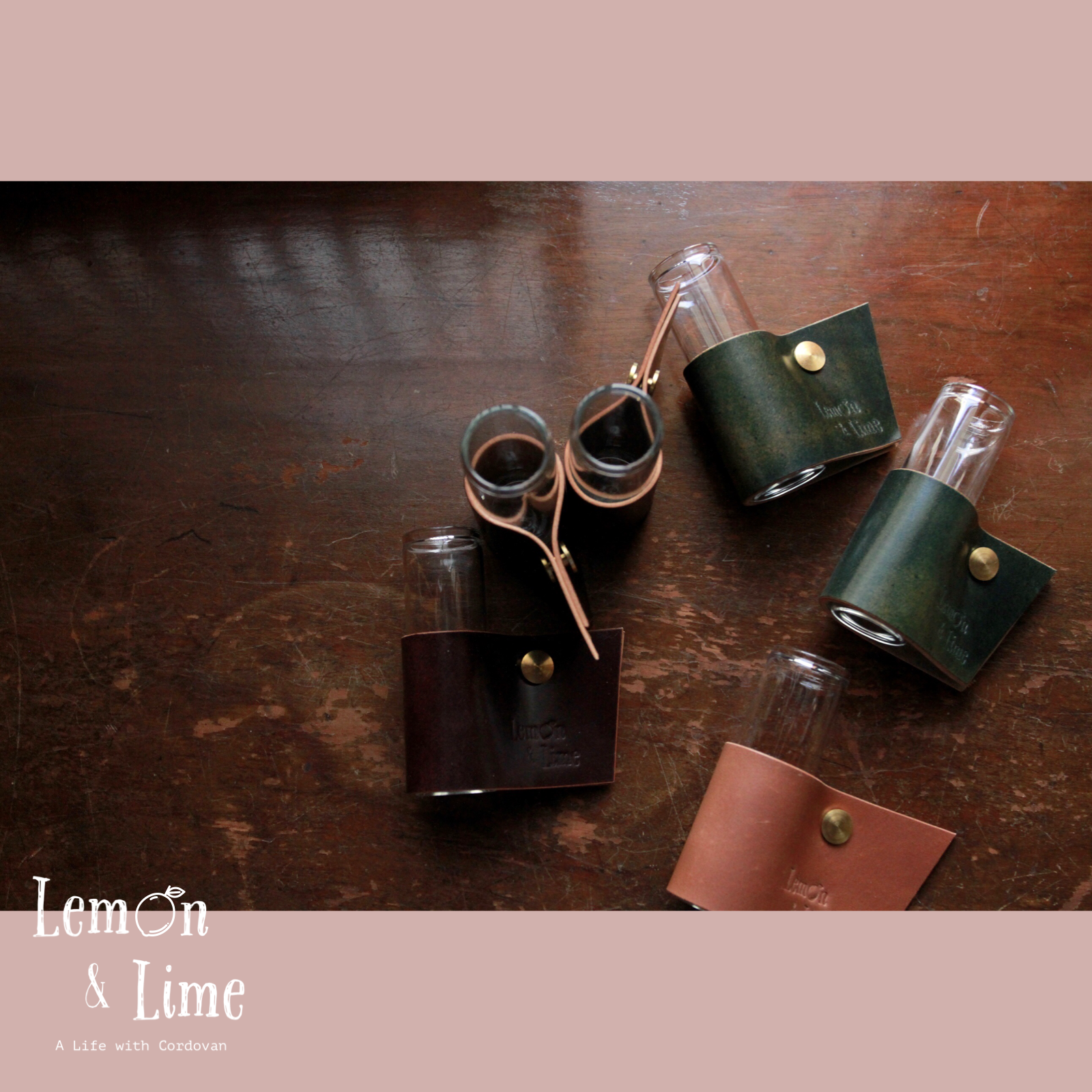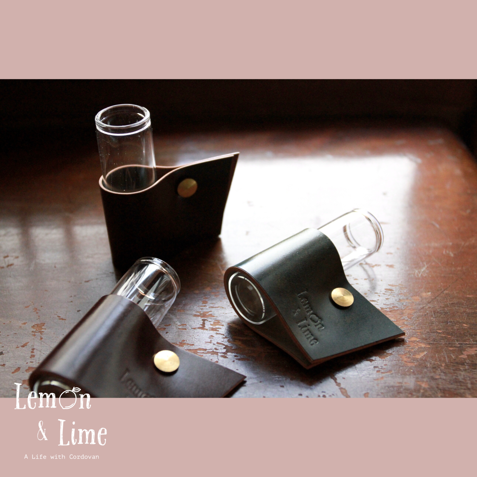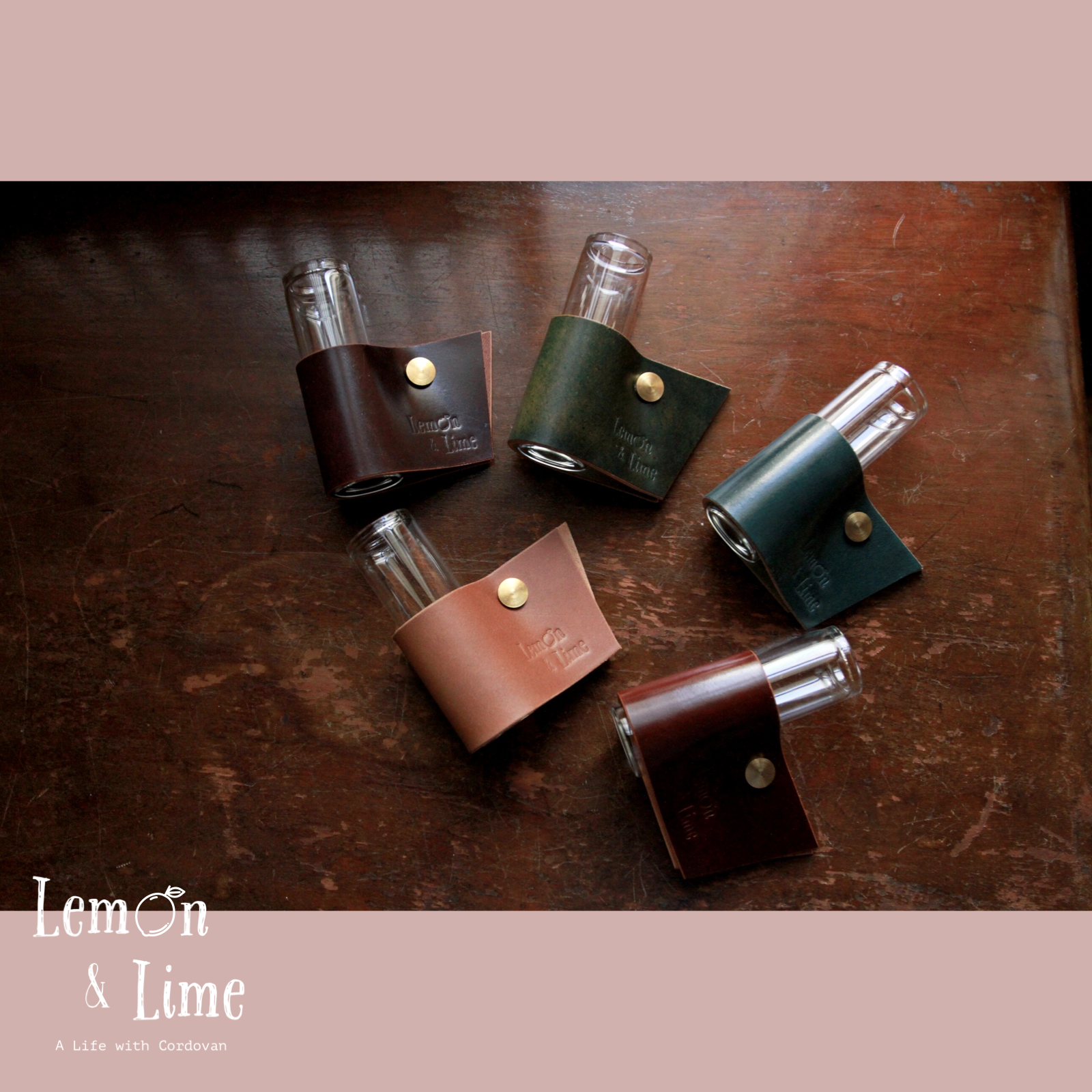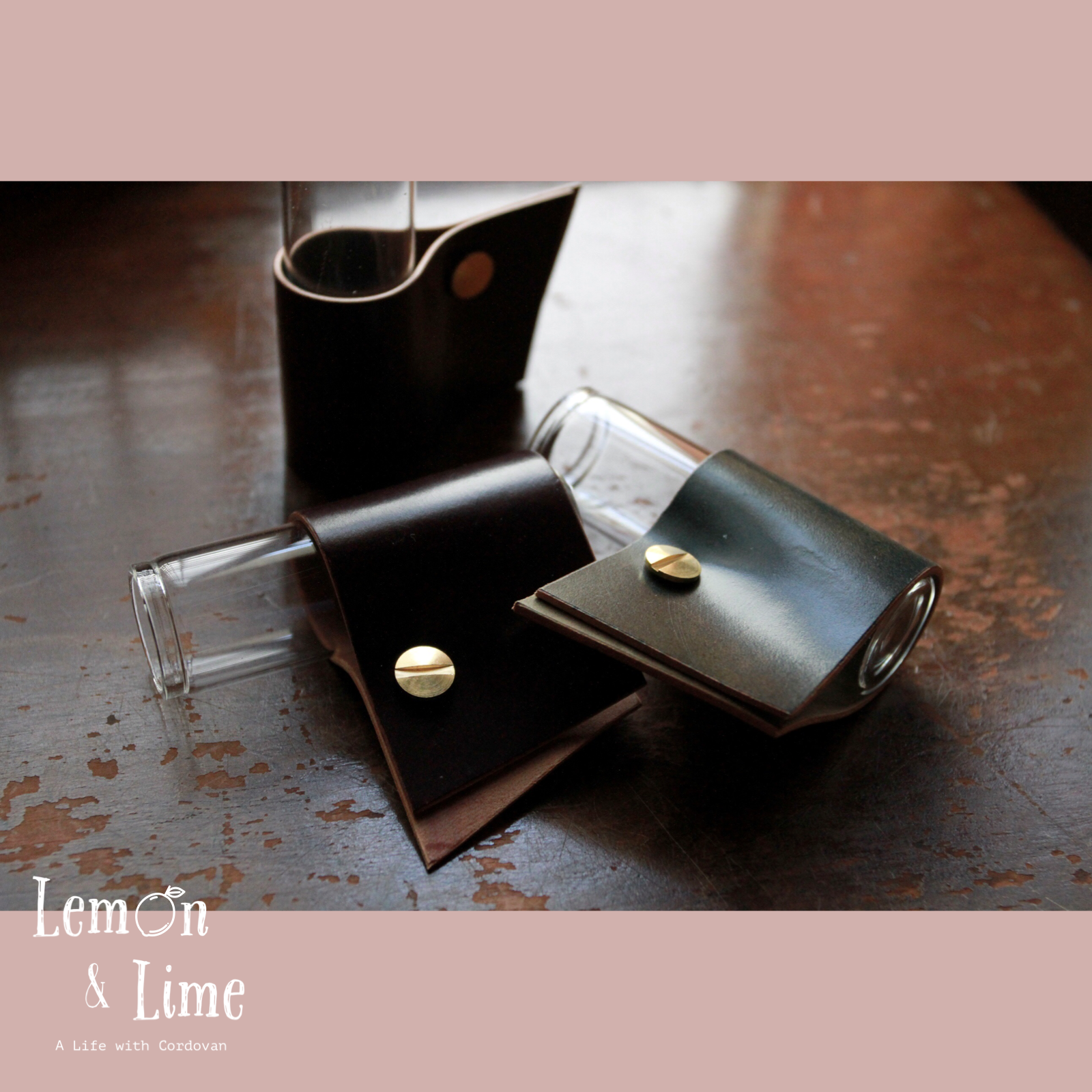 コードバンをクルッと巻いて、真鍮製の留め具で固定しています。筒型のガラス製の瓶は、金具を緩めなくても引き抜くことができるので、水を換える時も革が濡れずに簡単に作業ができます!