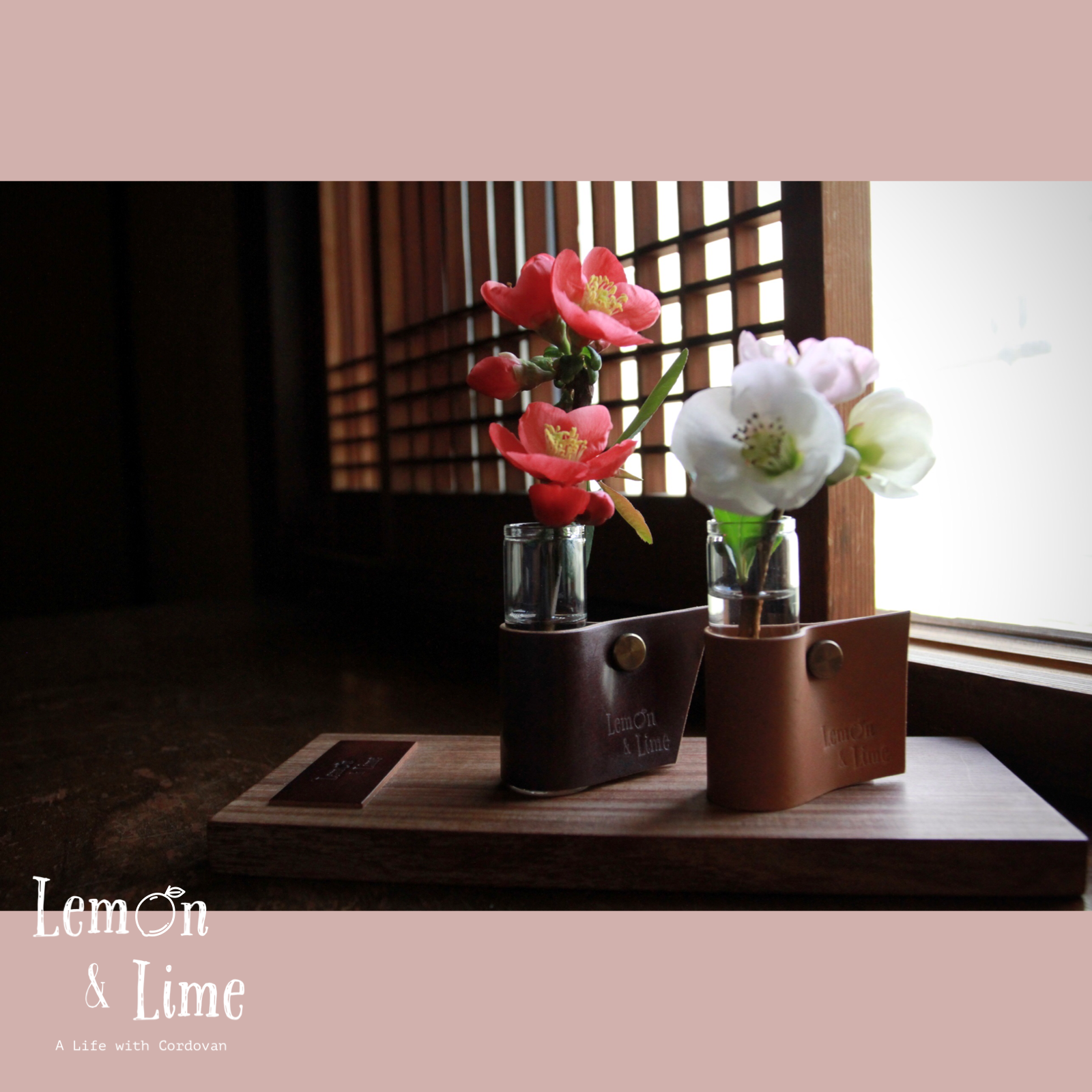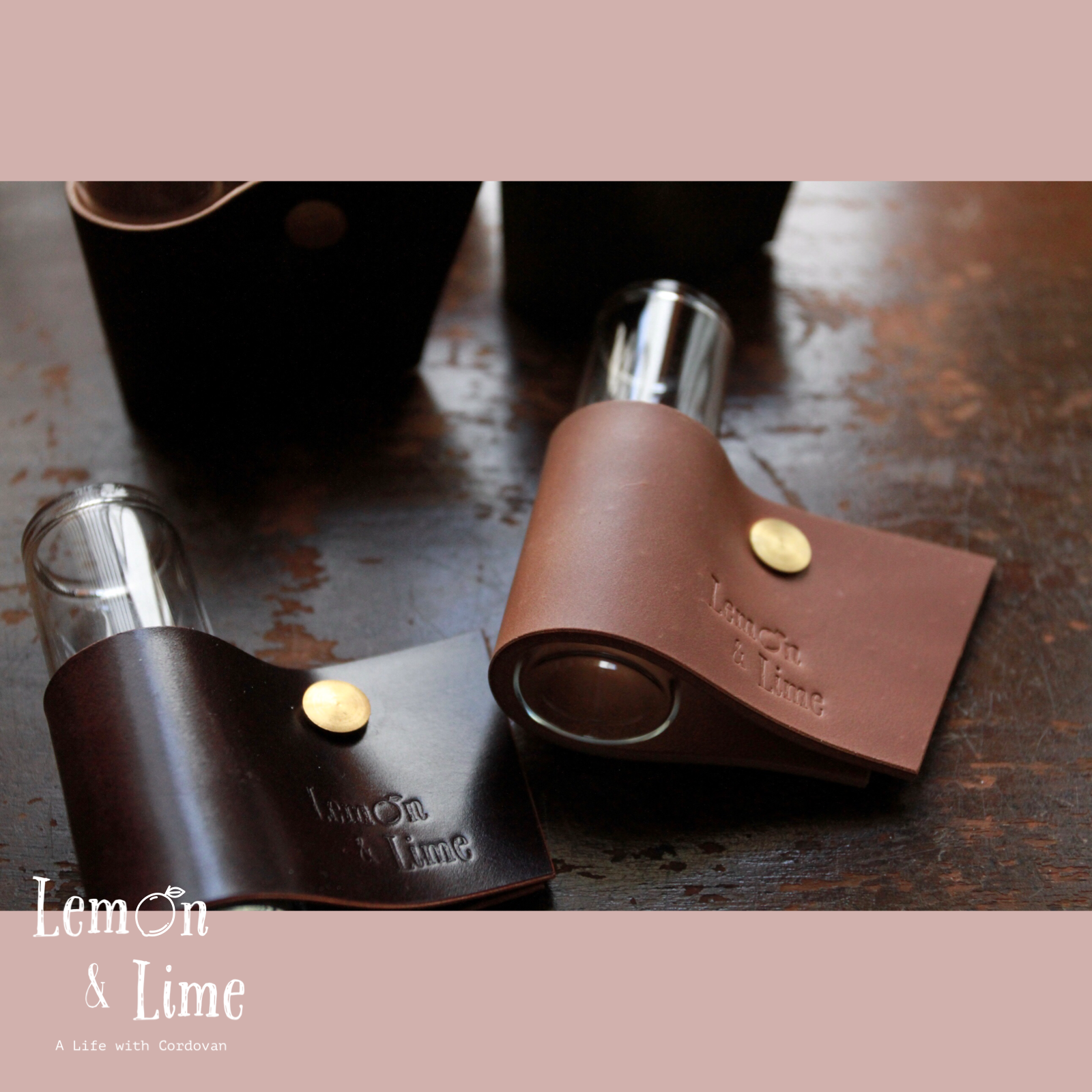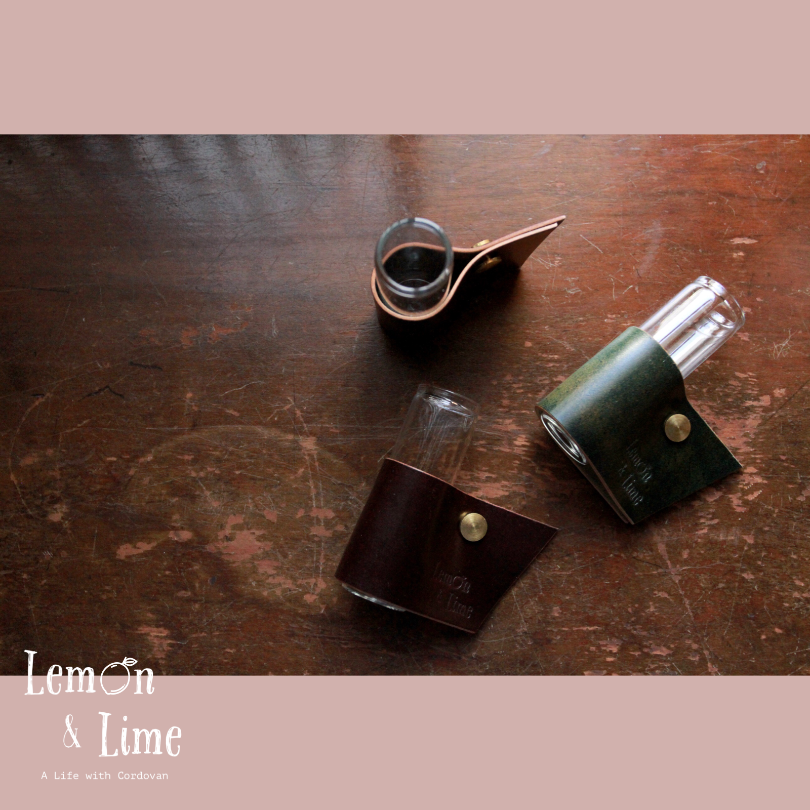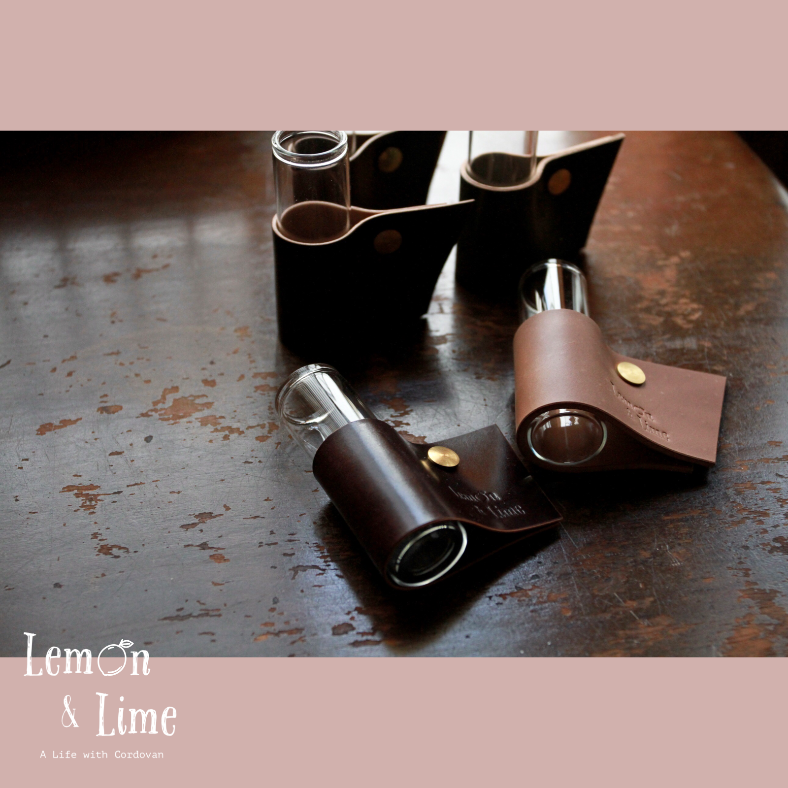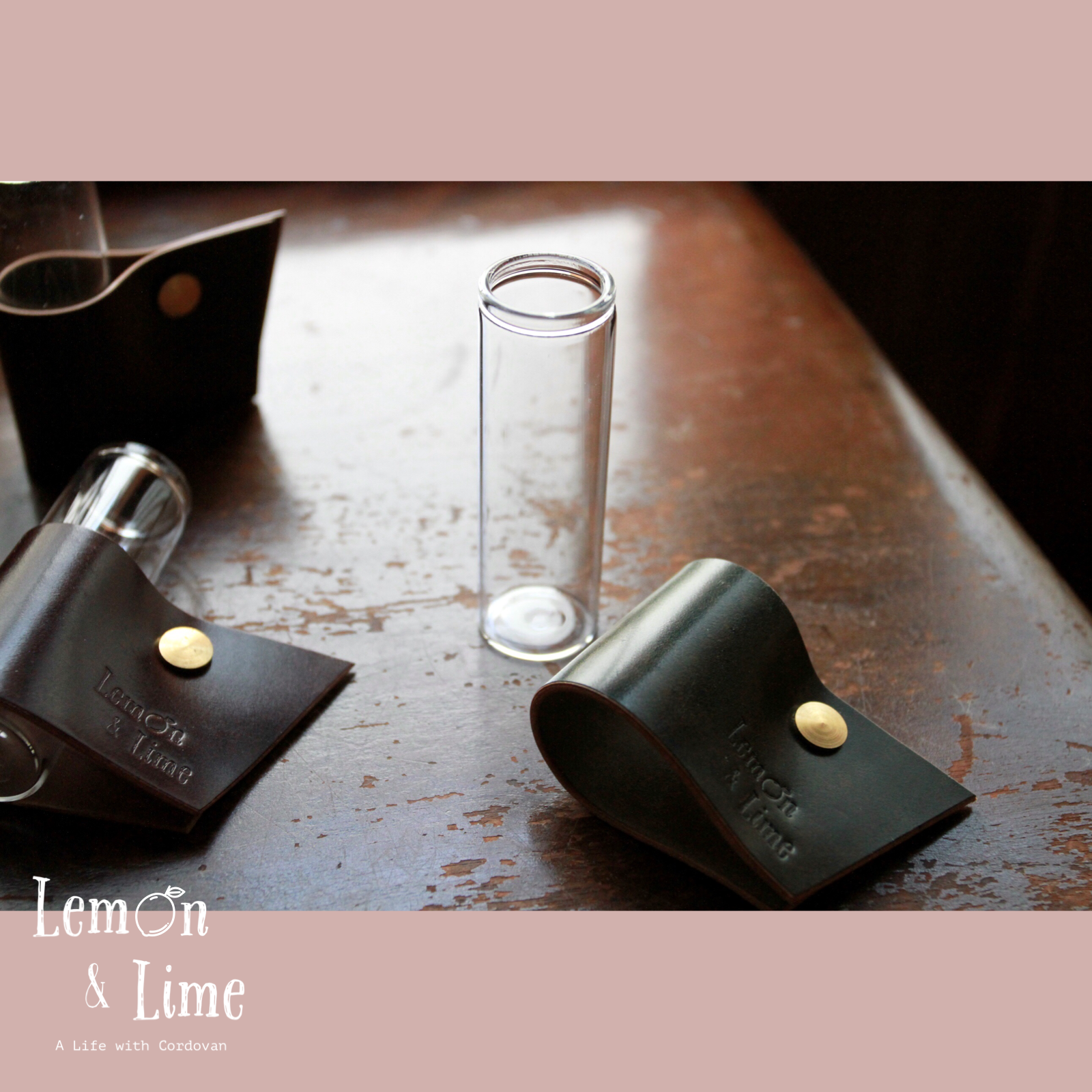 コードバンをクルッと巻いて、真鍮製の留め具で固定しています。筒型のガラス製の瓶は、金具を緩めなくても引き抜くことができるので、水を換える時も革が濡れずに簡単に作業ができます!