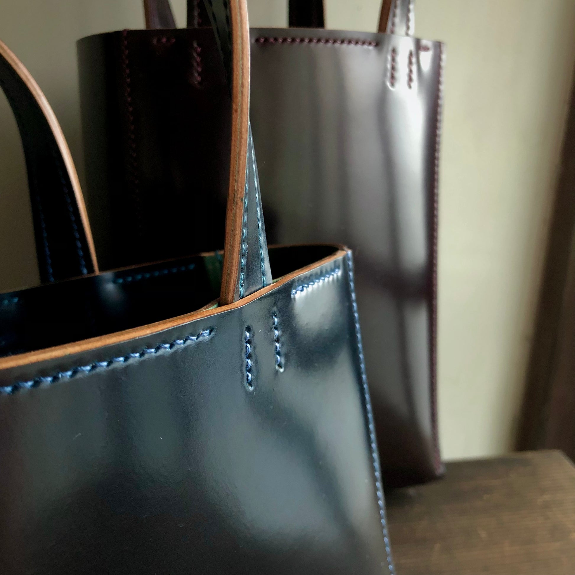 コードバンのみを使用して仕上げたミニサイズのよこ型トートバッグです。すべて手縫いで製作しています。底鋲など、留め具など金具のパーツは使用していません。